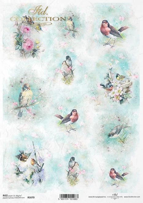 Csodálatos dekupázstechnikához használható rizspapír, a madárkák halványan tompítva kissé ködösen látszanak ettől olyan titokzatosak, de csodásak.